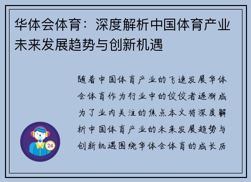 随着中国体育产业的飞速发展,华体会体育作为行业中的佼佼者,逐渐成为了业内关注的焦点。本文将深度解析中国体育产业的未来发展趋势与创新机遇,围绕华体会体育的成长历程、市场动态、创新驱动以及行业面临的挑战,全面阐述未来体育产业可能呈现的新格局。从运动科技的崛起到全民健身的兴起,再到资本投入的不断加码,本文将分析每一方面如何促进体育产业的变革与创新。通过这些分析,本文还将探讨华体会体育如何在激烈的市场竞争中抓住机遇,推动中国体育产业走向更加多元和成熟的未来。