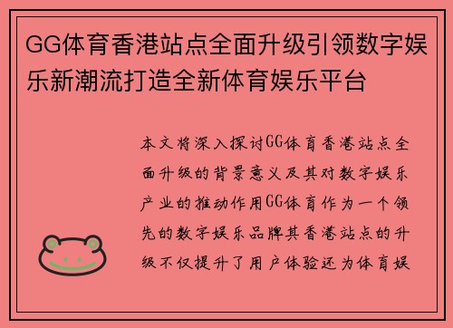GG体育香港站点全面升级引领数字娱乐新潮流打造全新体育娱乐平台